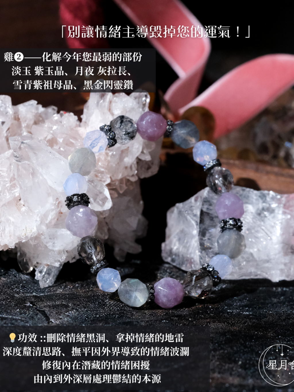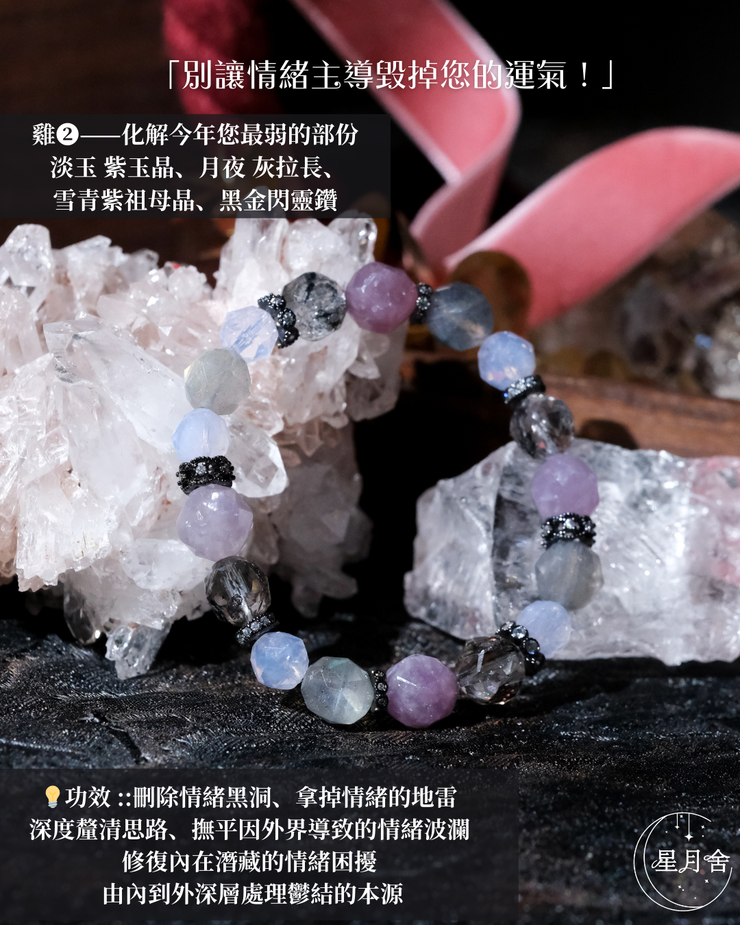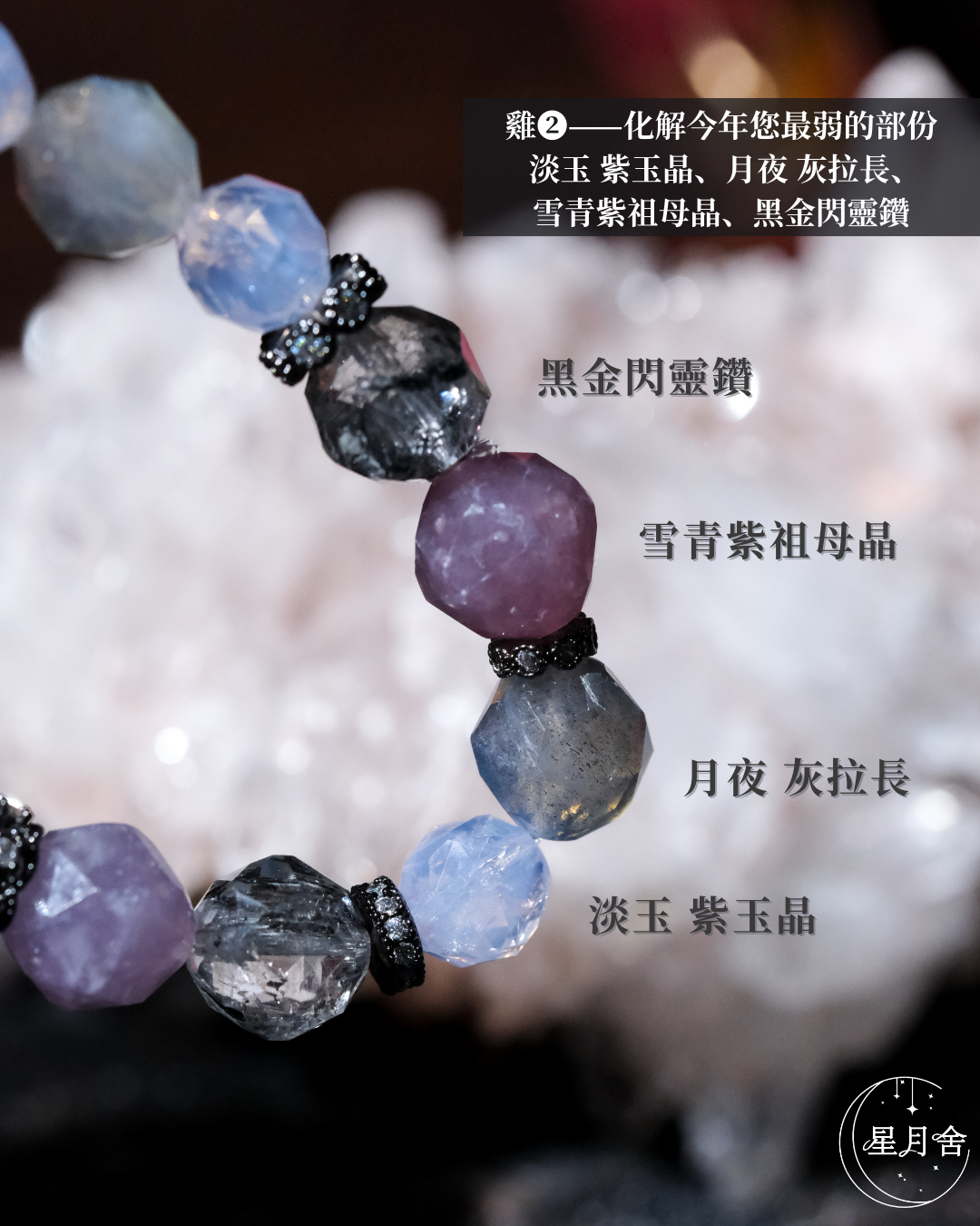 {淡玉 紫玉晶、月夜 灰拉長、雪青紫祖母晶、黑金閃靈鑽}