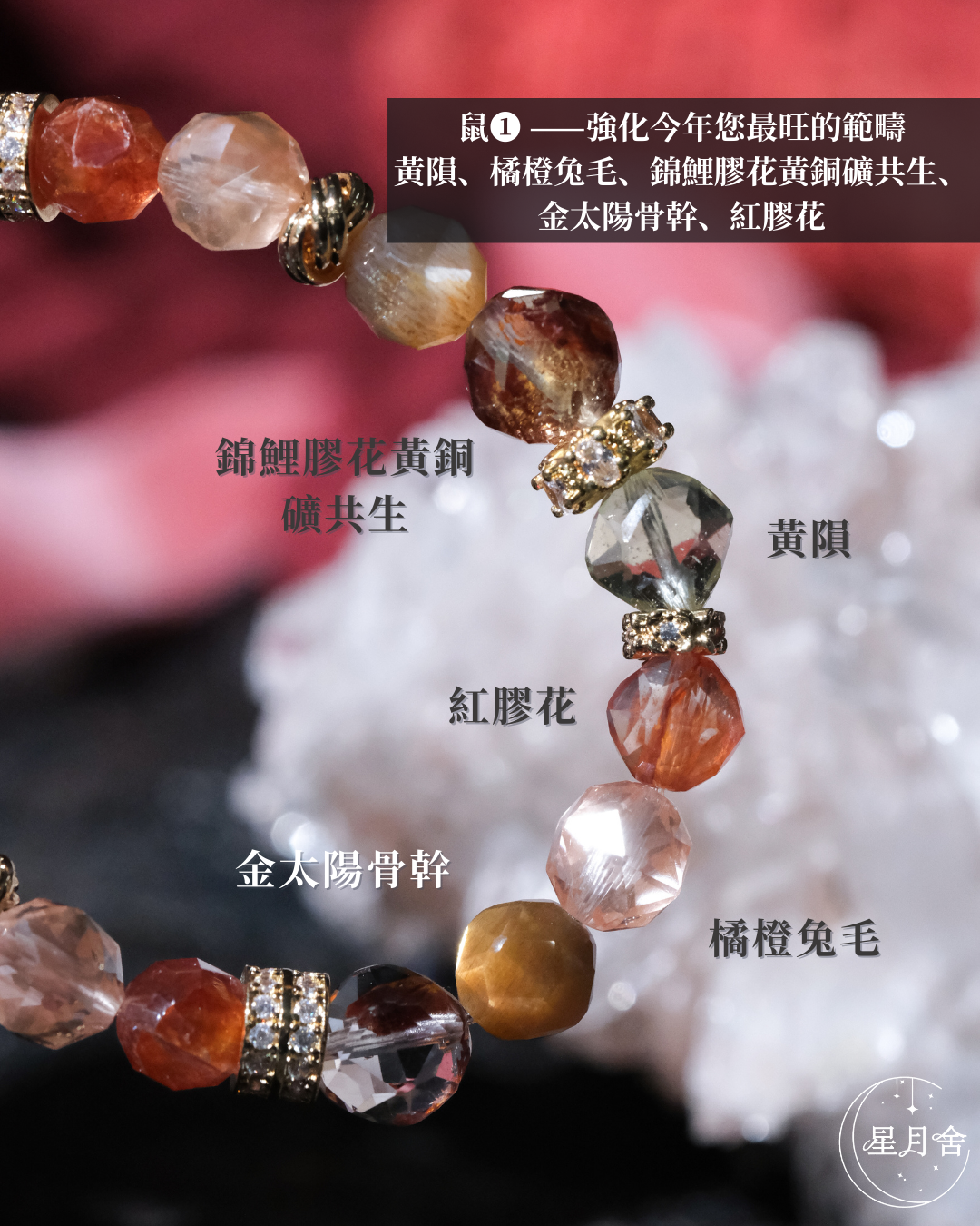 {黃隕、橘橙兔毛、錦鯉膠花黃銅礦共生、金太陽骨幹、紅膠花}